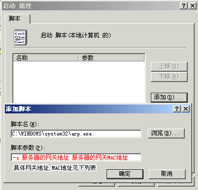 3、启动(右键选属性),在打开的启动 属性 对话框点击添加,在打开的添加脚本对话框输入 以下内容: 脚本名里输入:C:\WINDOWS\system32\arp.exe (注意你的实际安装盘符,winnt or windows目录) 脚本参数里输入: -s 服务器的网关地址 服务器的网关MAC地址 例如:您的服务器IP地址为59.36.100.95 那么您的服务器网关地址为59.36.100.65 网关 MAC地址为 00-E0-FC-70-46-7D。脚本参数里就应该输入:-s 59.36.100.65 00-E0-FC-70-46-7D